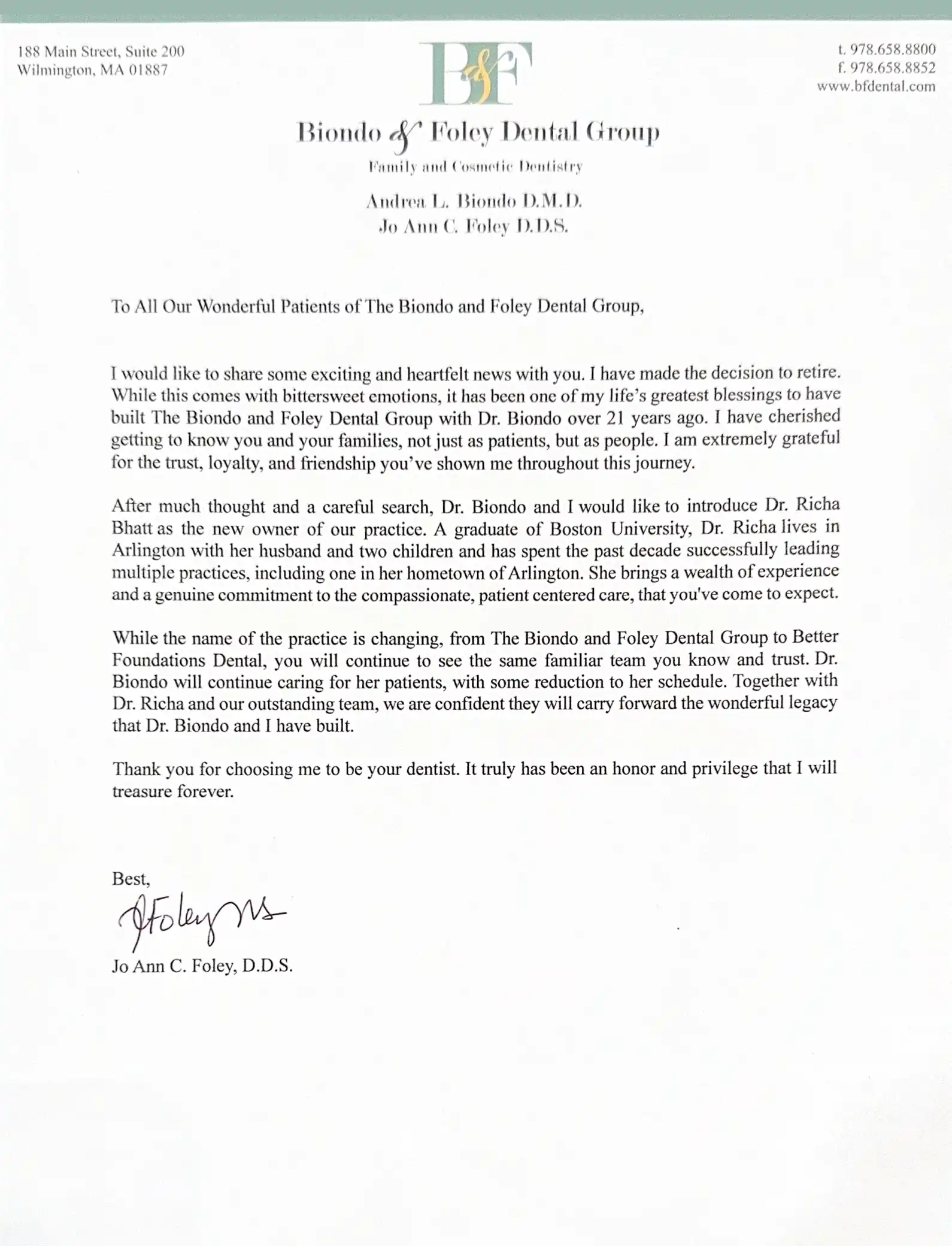 After 21 Years, Dr. Foley has decided to retire. You can read Dr. Foley’s letter to her patients here. Thank you Dr. Foley.